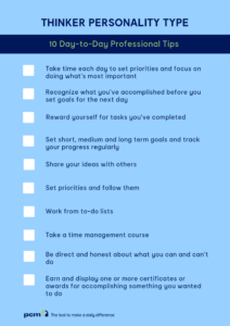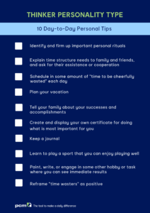 In personal situations, their Thinker Base approach can help them organize their life and family in a manner that allows them time to relax. People know that they can depend on them to follow through on their words. They are also responsible and reasonable.